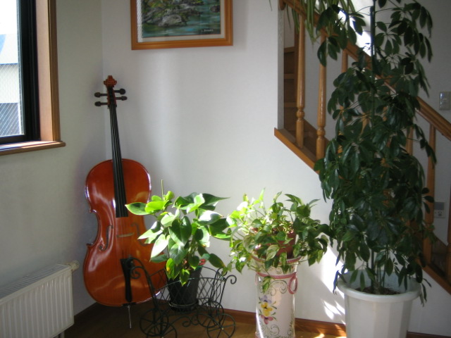 」玄関ホールのチェロ、毎日生徒達に見つめられ興味を持たれ、
